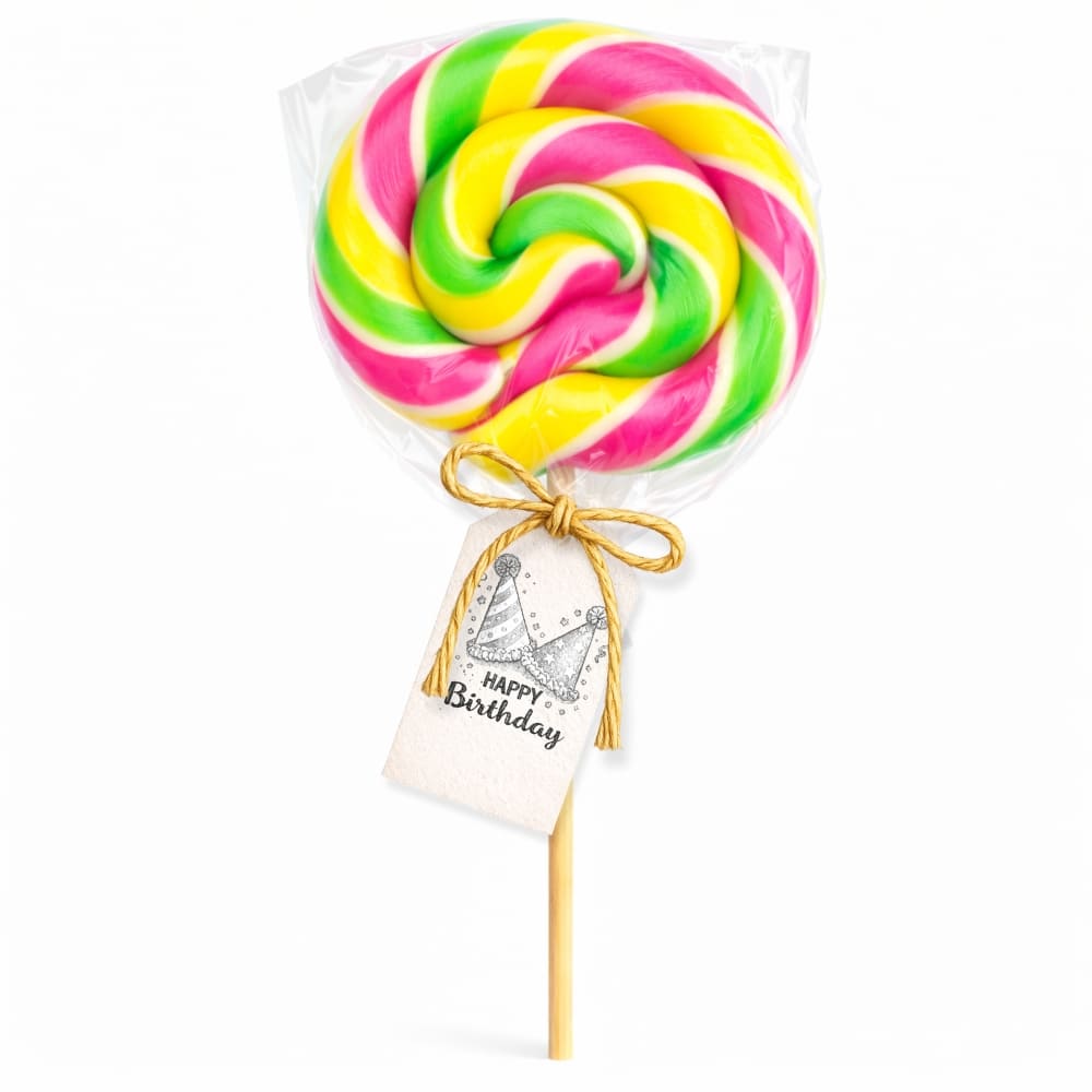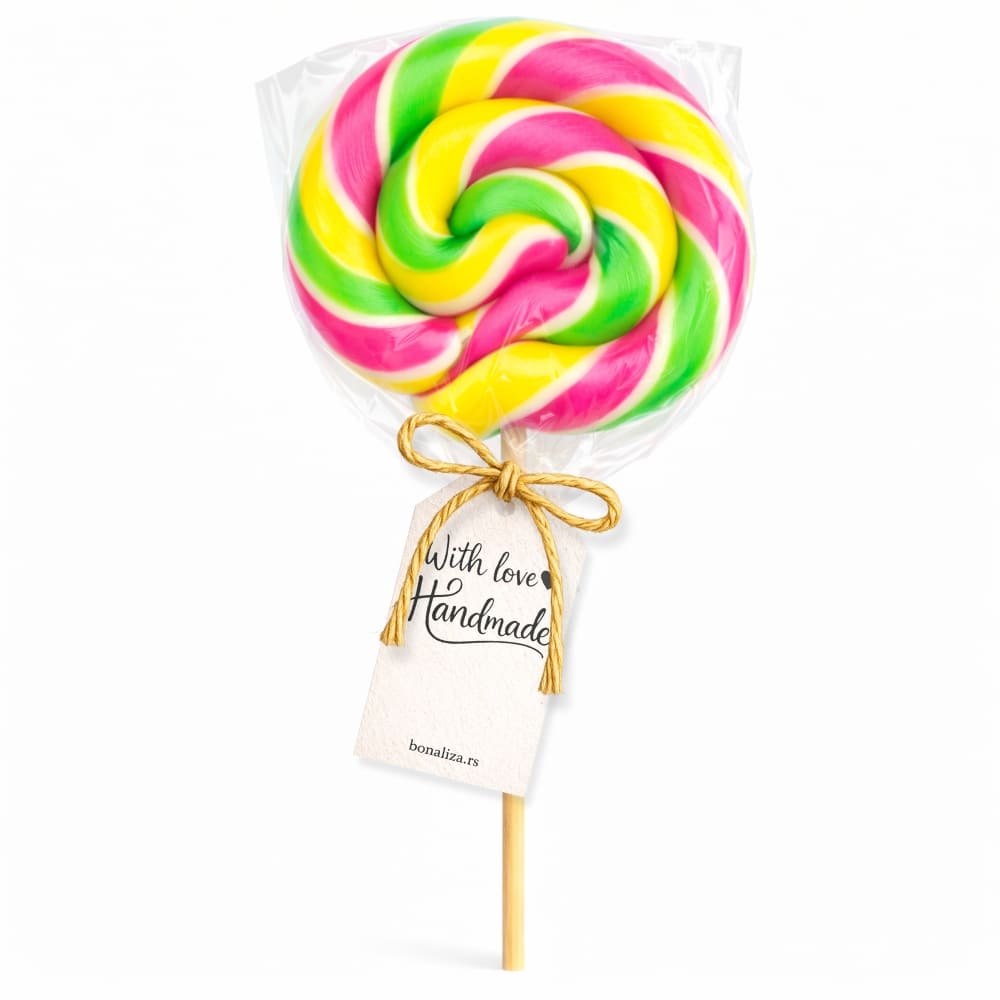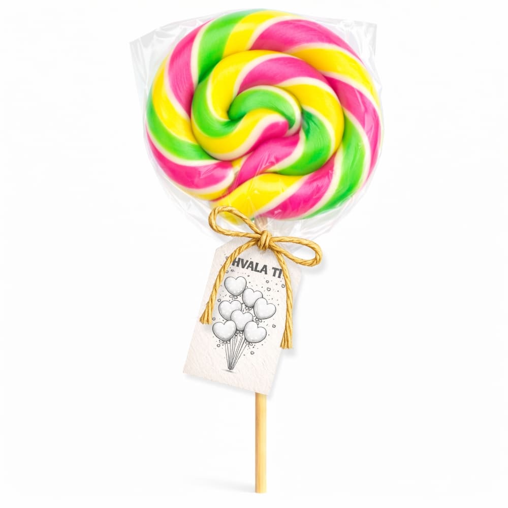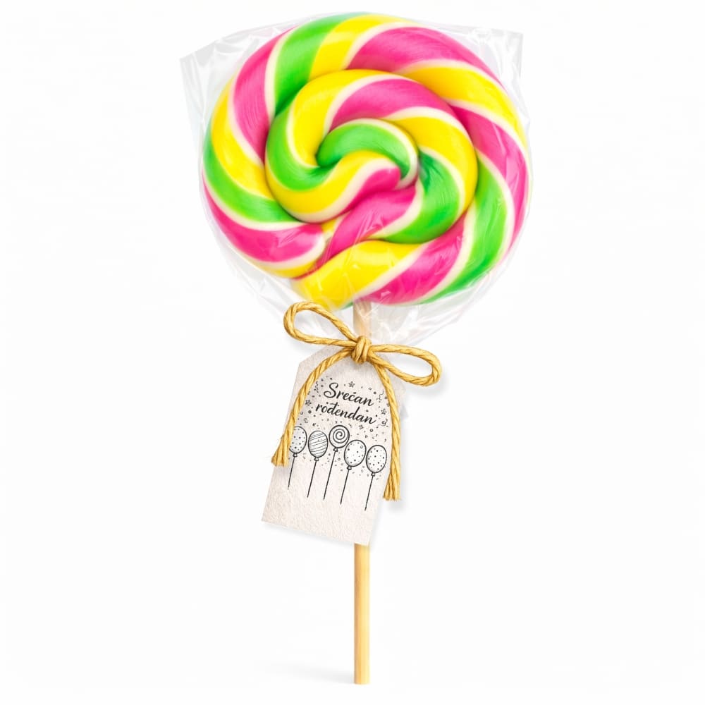 Unesite eksploziju boja, ukusa i veselja uz šarenu Rainbow Swirl lizalicu, ručno izrađenu i obogaćenu mogućnošću personalizacije mašnicom po izboru.